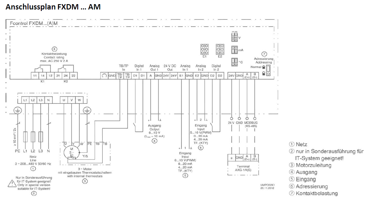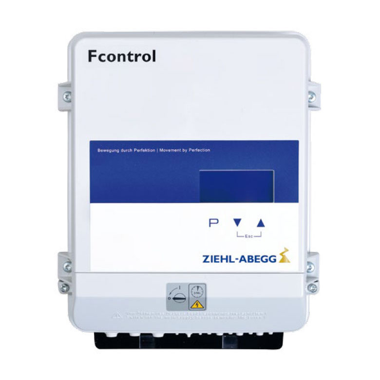 3~Fcontrol Basic, FXDM … AM: Die Frequenzumrichter 3~ Fcontrol, mit allpolig wirksamem Sinusfilter mit integriertem Display als Drehzahlsteller zur Verfügung. Die Drehzahlvorgabe kann durch eine übergeordnete Regelung per 0-10/10-0 V erfolgen, z.B. durch ein ZIEHL-ABEGG Regelmodul der Produktfamilie UNIcon. Manuell kann die Drehzahl durch den Anschluss eines Potenziometers vorgegeben werden. Die Frequenzumrichter regeln motorschonend, bedarfsgerecht und energiesparend Asynchronmotoren (Außenläufer Motoren, IEC Normmotoren).