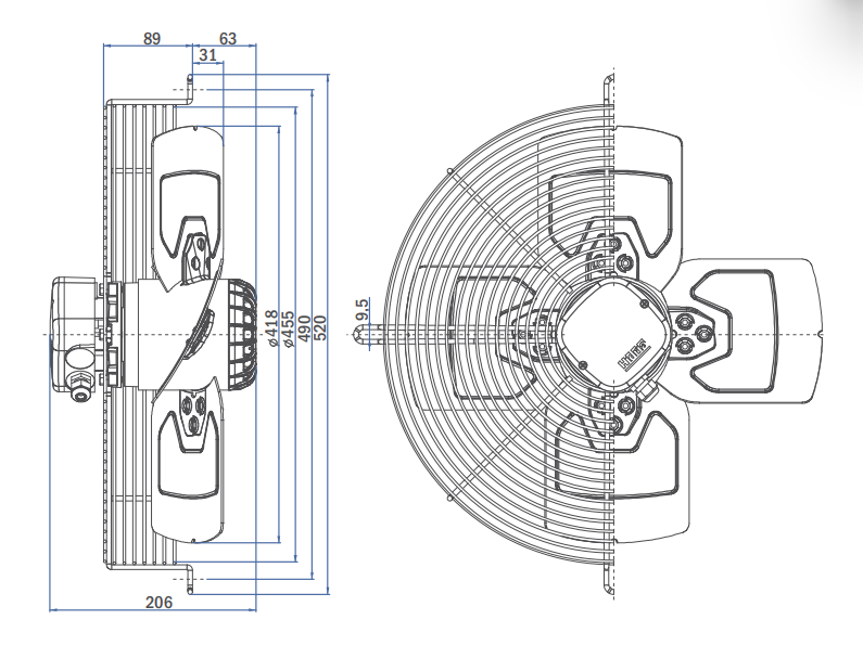 | Luftförderrichtung | A über Motor saugend (blowing) |